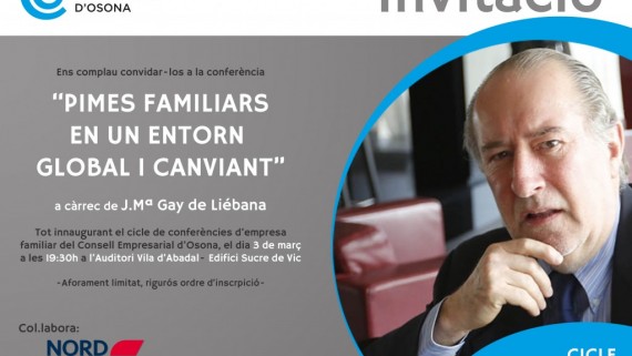 Tot innaugurant el cicle de conferències d’empresa familiar del Consell Empresarial d’Osona, el dia 3 de març a les 19:30, a l’Auditori Vila d’Abadal – Edifici Sucre de Vic, es portarà a terme la conferència “Pimes familiars en un un entron global canviat”, a càrrec de J.Mª Gay de Liébana.